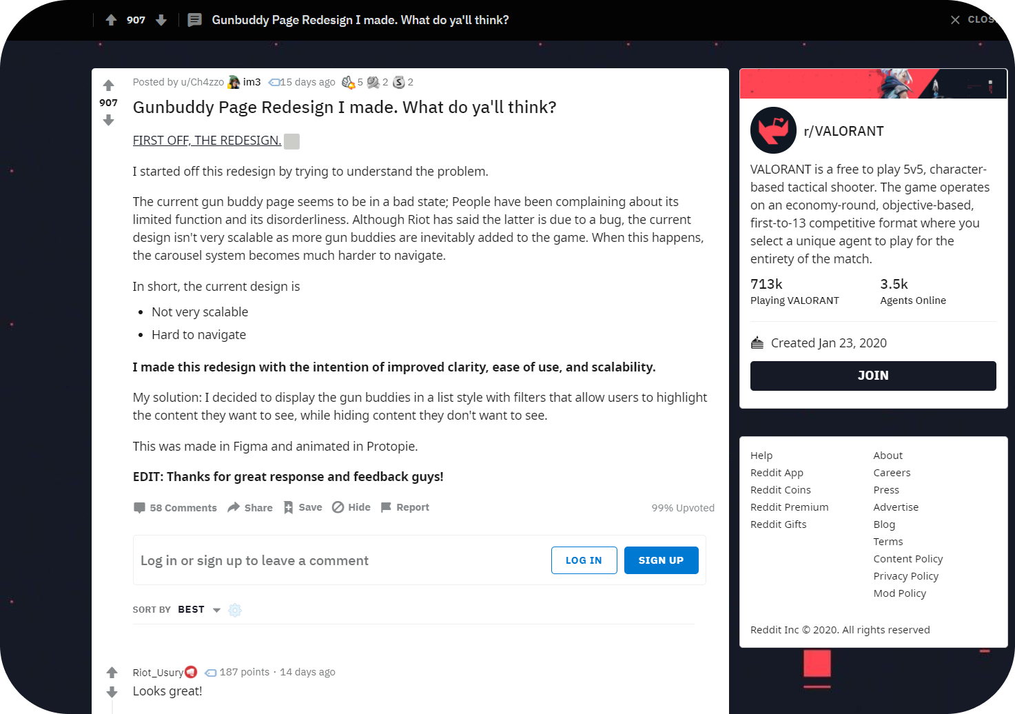 I posted on the VALORANT subreddit about my redesign and got great feedback. Overall the response was positive, and I even got a response from a Riot developer!